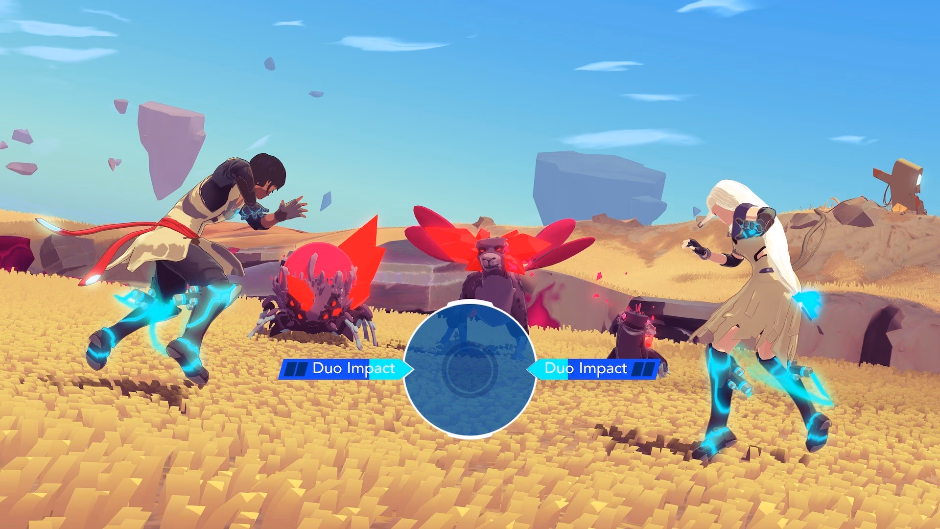 I was initially afraid that combat would be tedious or detract from the cozy vibe, especially since the first few hours focus solely on the gliding and exploration. Turns out, it wasn’t that way, and it complemented the game perfectly. The fighting is best described as a rock-paper-scissors-like system; some enemies are weak to Blast, some to Impact, and often you need to time a guard or stun them with one character before following up with a quick pre-charged attack from the other. You command both characters, using the D-pad for Kay and the face buttons for Yu, with just five commands in total for each.