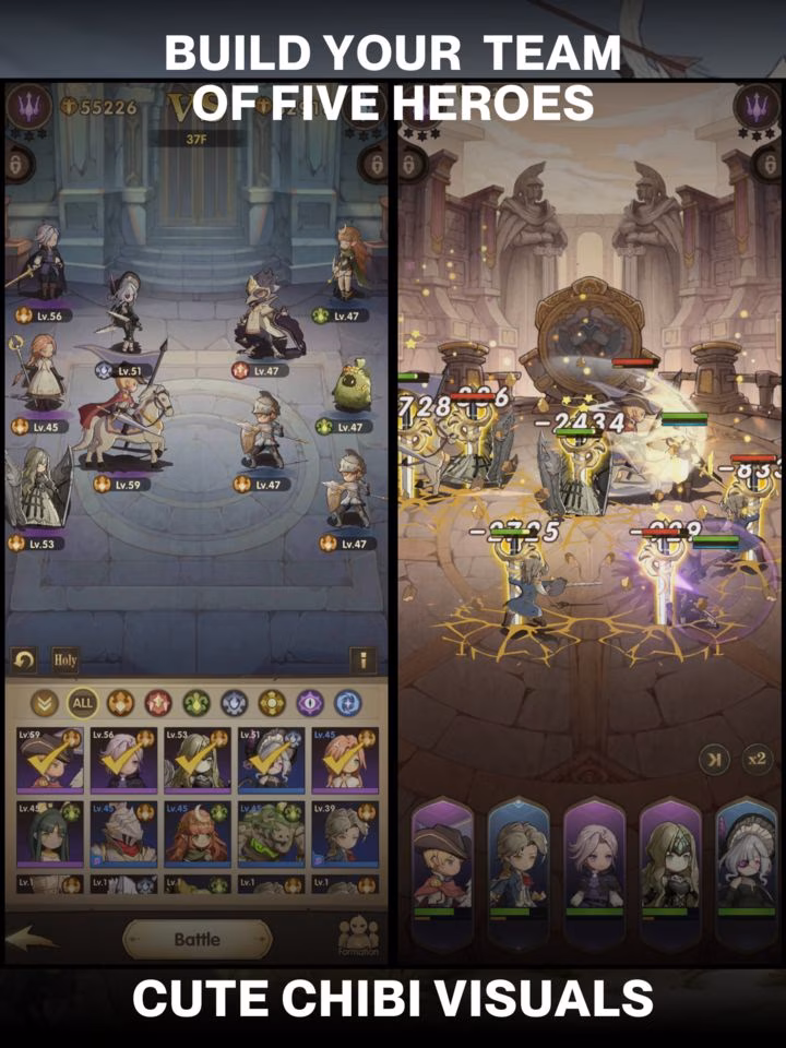 The gameplay follows an auto-battler style, where you set a roster of up to five heroes and let them battle automatically enemies. There’s not much depth to it and the outcome is mostly determined by the overall team level, although hero composition plays a small role. While the manual activation of hero special abilities is an option in solo missions, it provides only a false sense of control, as the battles are designed to be automated. Overall, battles are fast-paced, lasting only a few seconds to a minute at most, but just like the combat, progression largely hinges on character levels.