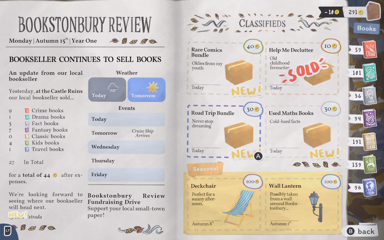 Finally, there’s the setting of Bookstonbury. While the town is charming, you really have to suspend your disbelief regarding how fast these inhabitants are reading. Roughly same set of people (aside from the tourists) are buying and recycling tons of books almost every single day. It’s a bit immersion-breaking when you see societies buying massive amounts of books in one go and then repeating the feat the very next day, but it’s a small price to pay for a steady stream of customers in a game. Completely understandable.
